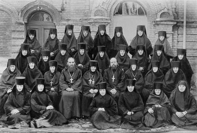 Духовенство и насельницы Вильнюсского женского монастыря во имя Равноапостольной Марии Магдалины. Во 2-м ряду в центре - игум. Нина (Баташева), слева от нее прот. Николай Гурьянов, справа - прот. Сергий Беляев. В верхнем ряду 4-я справа - мон. Варвара (Трофимова). Фотография. 1957 г.